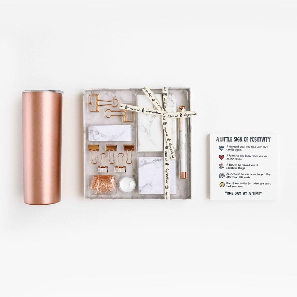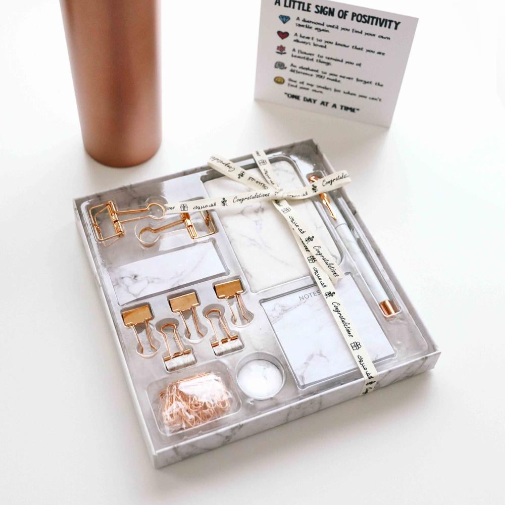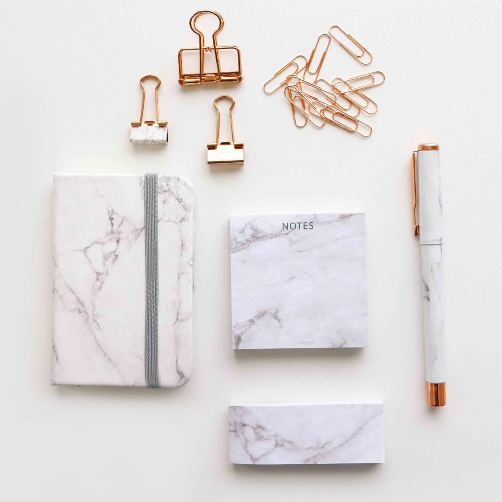 - مجموعة قرطاسية ماربل تتضمن: قلم، أوراق ملاحظات، مشابك، دفتر